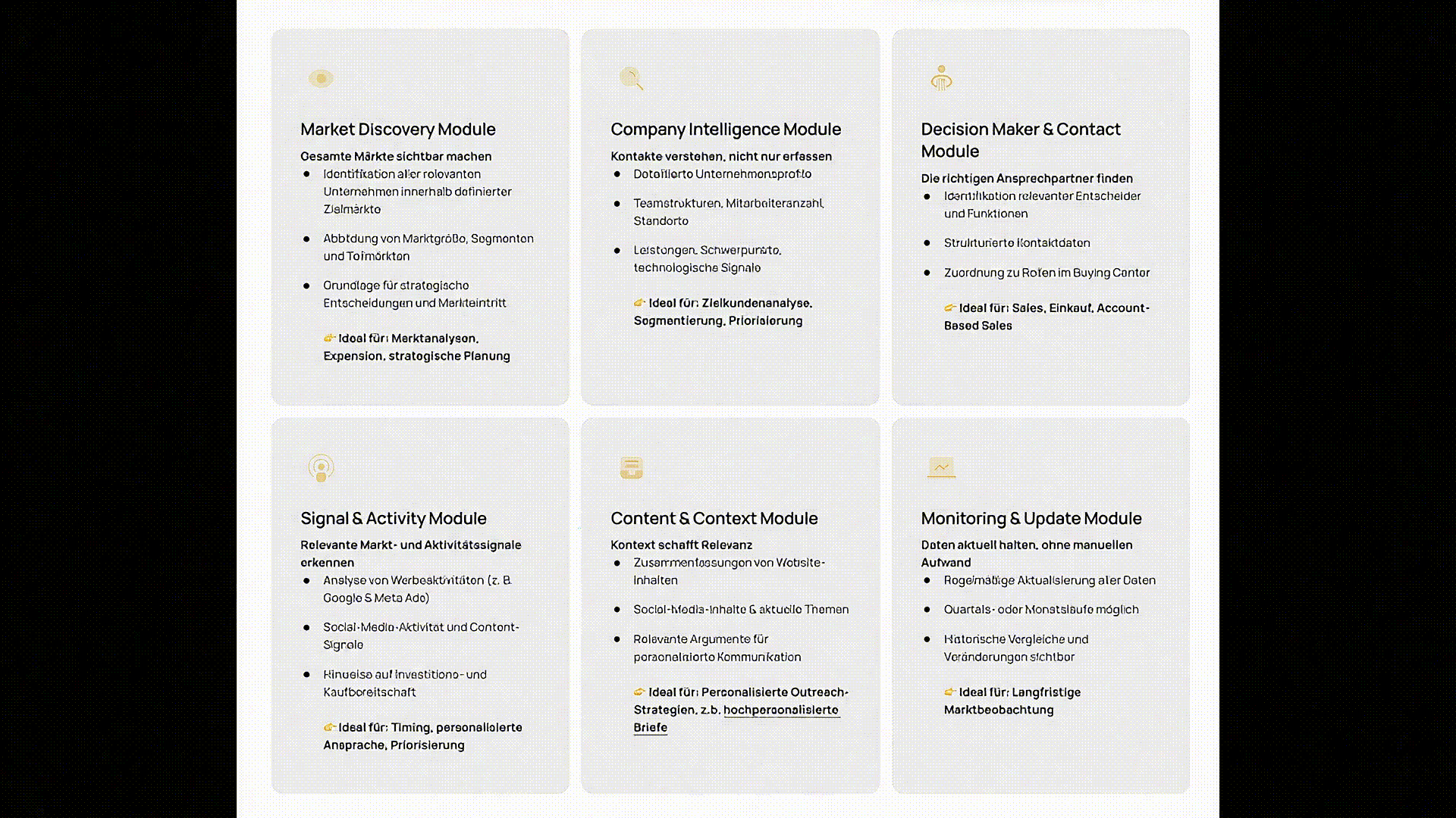 Unsere Solution Modules erlauben es, genau die Daten, Analysen und Signale zu kombinieren, die für Ihre Vertriebs‒ und Marketingziele relevant sind, vollständig automatisiert und skalierbar.